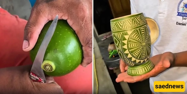SAEDNEWS: The art of carving on fruits and natural peels has once again captured widespread attention on social media. In a recently viral video, an artist uses simple tools to showcase the remarkable transformation of a raw green fruit into an artistic cup adorned with intricate geometric patterns.