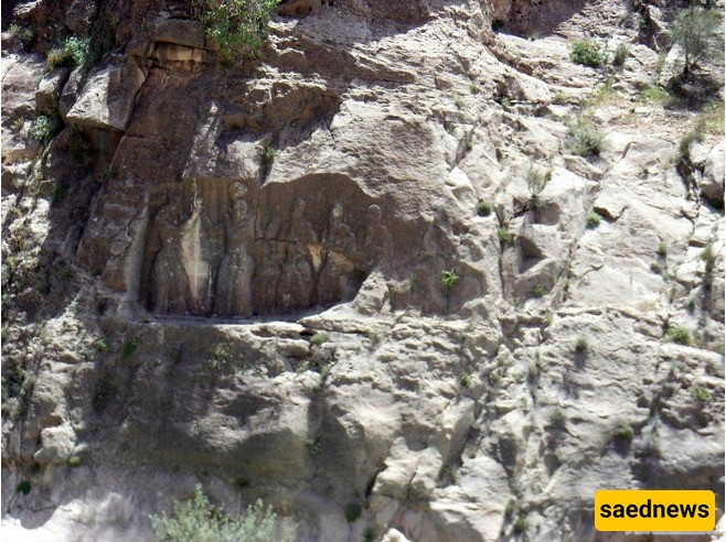 Fifteen kilometers before Firuzabad, on the right side of Tangab across the river at the mountain’s waist, lies the relief depicting Ardeshir’s coronation, founder of the Sassanian dynasty. In this scene, the Mithra figure places the royal crown on Ardeshir. Behind the king is a child, possibly the heir Shapur I, followed by three ministers and commanders standing respectfully. A now-partially-eroded Pahlavi inscription once connected the king and Mithra figure, with another seven-line inscription nearby providing further context. The relief measures approximately 2 by 3 meters.
